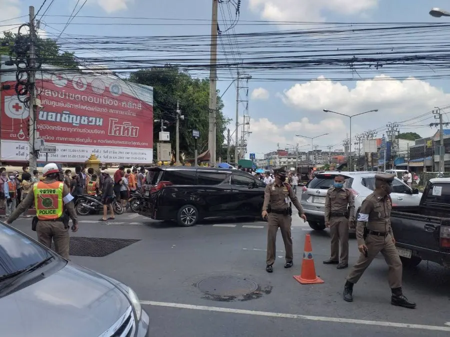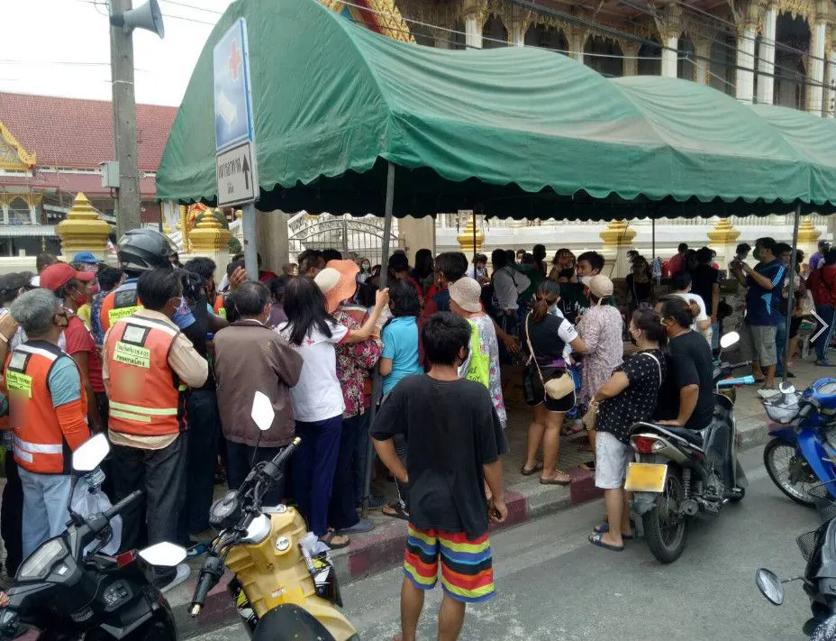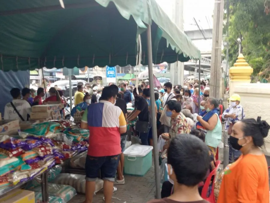 คนเนืองแน่น! บริเวณหน้าวัดดอนเมือง มีการแจกข้าวสารอาหารแห้ง มีคนจำนวนมาก การจราจรติดขัด