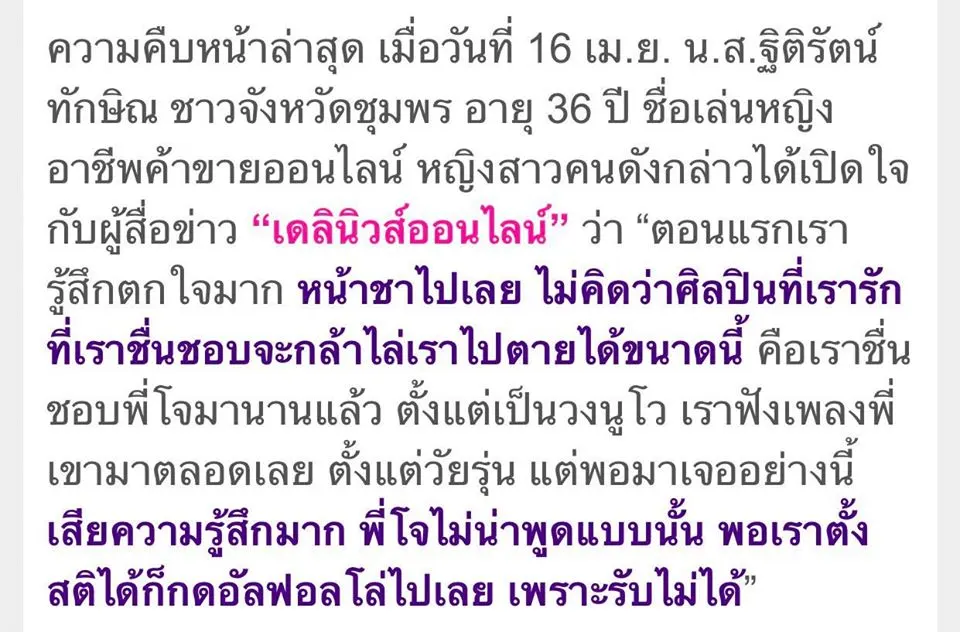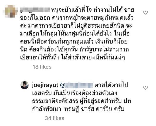 จนมีแฟนคลับเดือดร้อนอาจจะฆ่าตัวตายกันหมดว่า หนูจะบ้าแล้วพี่โจ ทำงานไม่ได้ ขายของก็ไม่ออก คนรากหญ้าจะตายหมู่กันหมดแล้วค่ะ มาตรการเยียวยาก็ไม่ยุติธรรมเลยซักนิด จะมาเลือกให้กลุ่มโน้นกลุ่มนี้ก่อนได้ยังไง ในเมื่อตอนนี้เดือดร้อนกันทุกกลุ่มแล้ว เงินเก็บก็น้อยนิด ต้องกินต้องใช้ทุกวัน ถ้ารัฐบาลไม่สามารถเยียวยาให้ทั่วถึง ได้ฆ่าตัวตายหนีหนี้กันแน่ๆ