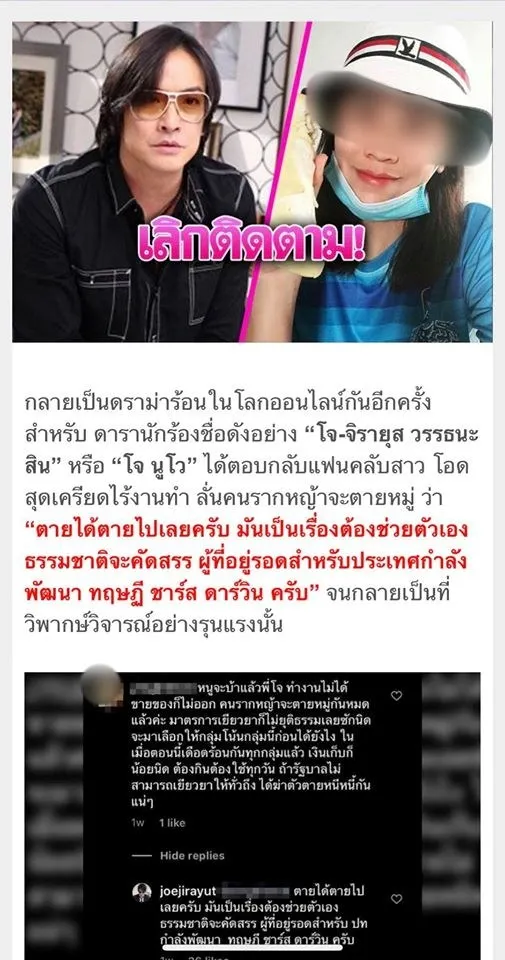 โดย โจ นูโว ได้เข้ามาตอบกลับคอมเมนต์ดังกล่าวว่า “ตายได้ตายไปเลยครับ มันเป็นเรื่องต้องช่วยตัวเองธรรมชาติจะคัดสรร ผู้ที่อยู่รอดสำหรับประเทศกำลังพัฒนา ทฤษฏี ชาร์ส ดาร์วิน ครับ”