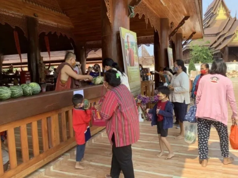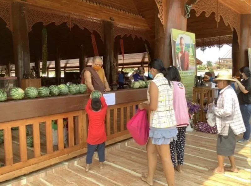 ซึ่ง 1 คนจะได้ 1 ลูก เพื่อให้ทั่วถึงกันทุกคน โดยจะแจกไปเรื่อย ๆ จนกว่าจะหมด ส่วนญาติโยมที่มารับแตงโม ทางวัดก็ได้ขอความร่วมมือให้สวมหน้ากากอนามัยทุกคน ล้างมือด้วยเจลแอลกอฮอล์ที่ทางวัดจัดไว้ให้ และรักษาระยะห่าง เพื่อป้องกัน COVID19