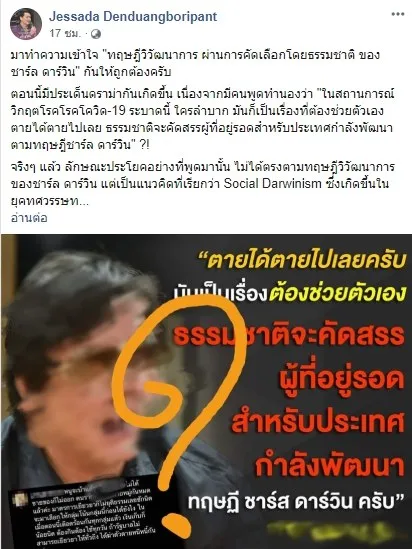 มาทำความเข้าใจ “ทฤษฎีวิวัฒนาการ ผ่านการคัดเลือกโดยธรรมชาติ ของชาร์ล ดาร์วิน” กันให้ถูกต้องครับ ตอนนี้มีประเด็นดราม่ากันเกิดขึ้น เนื่องจากมีคนพูดทำนองว่า “ในสถานการณ์วิกฤตโรคโรคโควิด-19 ระบาดนี้ ใครลำบาก มันก็เป็นเรื่องที่ต้องช่วยตัวเอง ตายได้ตายไปเลย ธรรมชาติจะคัดสรรผู้ที่อยู่รอดสำหรับประเทศกำลังพัฒนา ตามทฤษฎีชาร์ล ดาร์วิน” จริงๆ แล้ว ลักษณะประโยคอย่างที่พูดมานั้น ไม่ได้ตรงตามทฤษฎีวิวัฒนาการของชาร์ล ดาร์วิน แต่เป็นแนวคิดที่เรียกว่า Social Darwinism ซึ่งเกิดขึ้นในยุคทศวรรษที่ 1870s อ้างว่าเป็นการเอาหลักชีววิทยาของการคัดเลือกโดยธรรมชาติ (natural selection) และการอยู่รอดของผู้ที่ปรับตัวได้ดีกว่า (survival of the fittest) มาประยุกต์ใช้กับเรื่องรัฐศาสตร์สังคมวิทยา