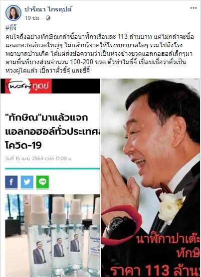 ทั้งนี้ทางเฟซบุ๊คของ น.ส.ปารีณา ไกรคุปต์ ส.ส.ราชบุรี สังกัดพรรคพลังประชารัฐ ได้มีการโพสต์ภาพข่าวพร้อมข้อความว่า “#ขี้จิ๊ คนใจถึงอย่างทักษิณกล้าซื้อนาฬิกาเรือนละ 113 ล้านบาท แต่ไม่กล้าจะซื้อแอลกอฮอล์ขวดใหญ่ๆ ไม่กล้าบริจาคให้โรงพยาบาลใดๆ รวมไปถึงโรงพยาบาลบ้านเกิด