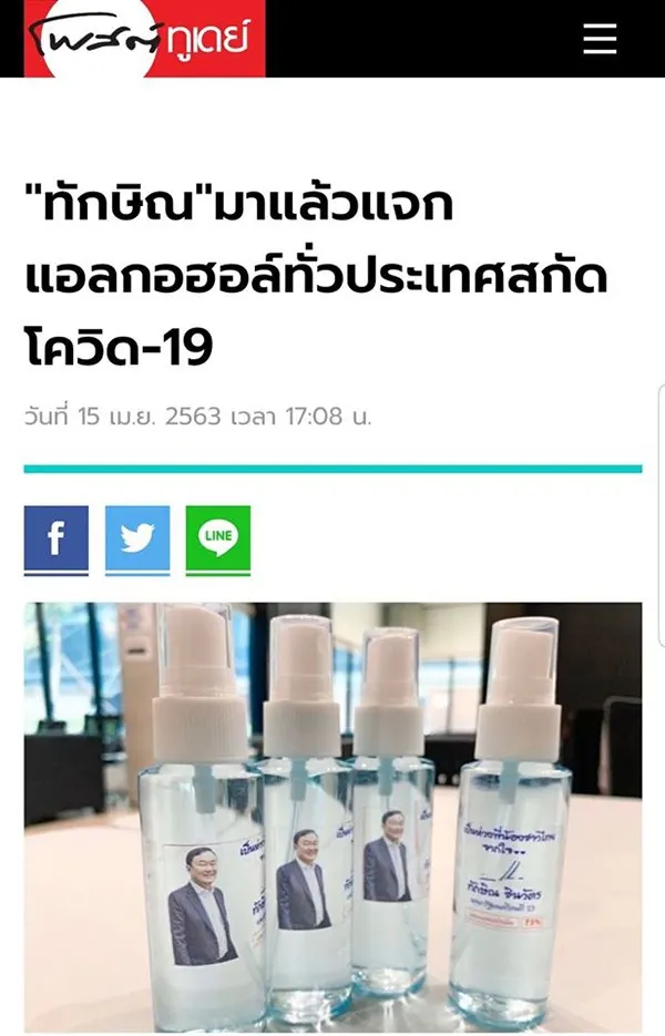 เมื่อวันที่ 16 เม.ย ที่รัฐสภา นายสมคิด เชื้อคง ส.ส.อุบลราชธานี พรรคเพื่อไทย นำแอลกอฮอล์ล้างมือ 75% ซึ่งมีภาพของนายทักษิณ ชินวัตร อดีตนายกรัฐมนตรี มาแจก พร้อมข้อความ “เป็นห่วงพี่น้องชาวไทย จากใจ ทักษิณ ชินวัตร นายกฯ คนที่ 23” และมีสื่อหลายสำนักให้ความสนใจนำไปทำเป็นประเด็นข่าว