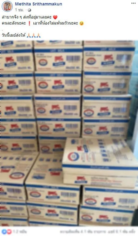 ล่าสุด ในโลกออนไลน์ได้แชร์โพสต์จากผู้ใช้เฟสบุ๊ค Methita Srithammakun โพสต์ข้อความระบุว่า “ลำบากจิงๆ ส่งที่อยู่มาเลยคะ คนละลังนะคะ เอาที่น้องไม่แพ้นมวัวนะคะ วันนี้เมย์ส่งให้” ซึ่งการโพสต์เพียงไม่นานก็มีคนเข้ามาขอความช่วยเหลือจำนวนมาก