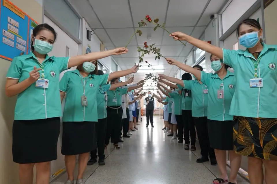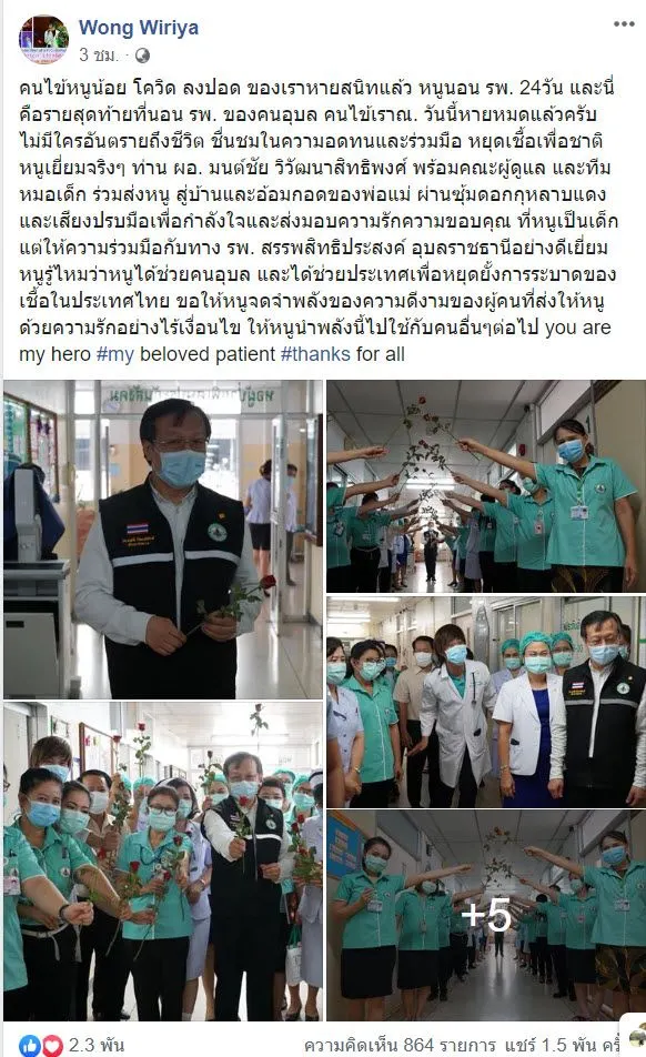ร่วมส่งหนู สู่บ้านและอ้อมกอดของพ่อแม่ ผ่านซุ้มดอกกุหลาบแดงและเสียงปรบมือเพื่อกำลังใจและส่งมอบความรักความขอบคุณ ที่หนูเป็นเด็กแต่ให้ความร่วมมือกับทาง รพ. สรรพสิทธิประสงค์ อุบลราชธานีอย่างดีเยี่ยม หนูรู้ไหมว่าหนูได้ช่วยคนอุบล และได้ช่วยประเทศเพื่อหยุดยั้งการระบาดของเชื้อในประเทศไทย ขอให้หนูจดจำพลังของความดีงามของผู้คนที่ส่งให้หนูด้วยความรักอย่างไร้เงื่อนไข ให้หนูนำพลังนี้ไปใช้กับคนอื่นๆต่อไป you are my hero #my beloved patient #thanks for all