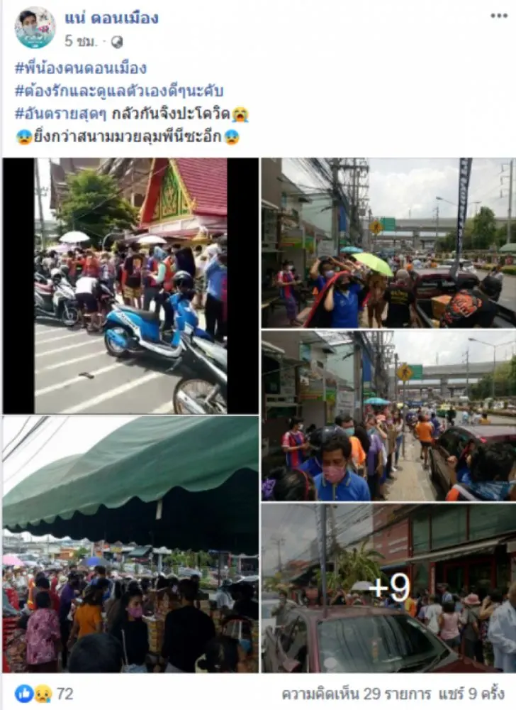 วันที่ 17 เมษายน 2563 ผู้สื่อข่าว siamnews ได้รับรายง่นว่า โลกออนไลน์มีการส่งต่อภาพเรื่องราวของผู้ใช้เฟซบุ๊กรายหนึ่งชื่อ แน่ ดอนเมือง ซึ่งเป็นภาพของประชาชนจำนวนมากพร้อมระบุข้อความว่า พี่น้องคนดอนเมือง ต้องรักและดูแลตัวเองดีๆนะคับ อันตรายสุดๆ กลัวกันจิงปะCD ยิ่งกว่าสนามมวยลุมพีนีซะอีก