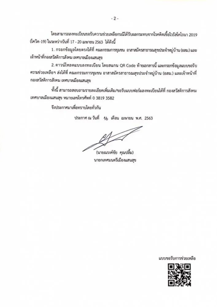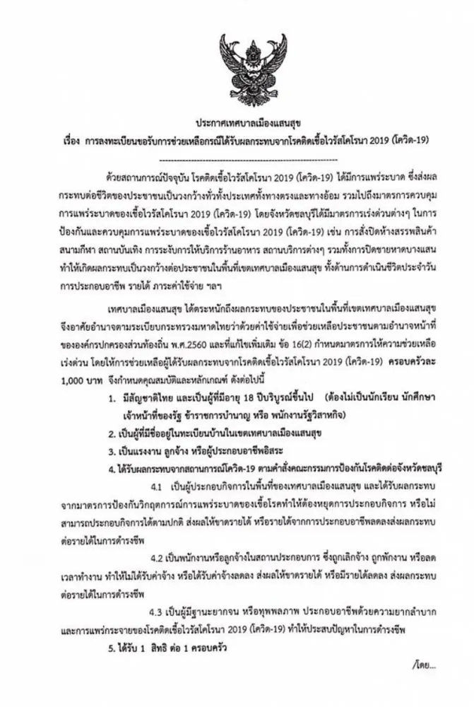 วันที่ 17 เมษายน 2563 ผู้สื่อข่าว siamnews ได้รับรายงานว่า เพจเฟซบุ๊กชื่อ เทศบาลเมืองแสนสุข จังหวัดชลบุรี ได้โพสต์ข้อความระบุว่า ประกาศเทศบาลเมืองแสนสุข เรื่อง การลงทะเบียนขอรับการช่วยเหลือกรณีได้รับผลกระทบจาก C D 2019
