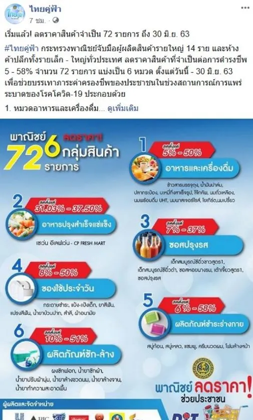 ไทยคู่ฟ้า กระทรวงพาณิชย์จับมือผู้ผลิตสินค้ารายใหญ่ 14 ราย และห้างค้าปลีกทั้งรายเล็ก ใหญ่ทั่วประเทศ ลดราคาสินค้าที่จำเป็นต่อการดำรงชีพ 5 ถึง 58 เปอร์เซ็น จำนวน 72 รายการ แบ่งเป็น 6 หมวด ตั้งแต่วันนี้ 30 มิถุนายน 63 เพื่อช่วยบรรเทาภาระค่าครองชีพของประชาชนในช่วงสถานการณ์วิกฤติ ประกอบด้วย