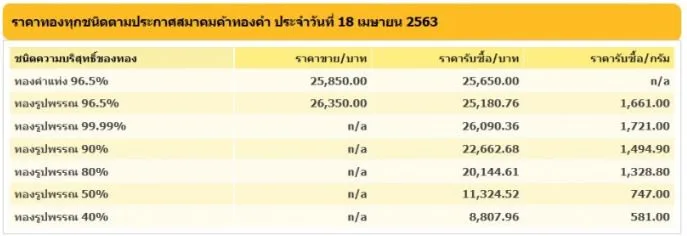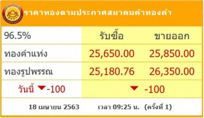 ราคาทองวันนี้ 18 เมษายน 2563 ปรับลง 100 บาท เมื่อเทียบกับราคาปิดเมื่อวานนี้ โดยทองคำแท่ง 96.5 เปอร์เซ็น ในประเทศ มีราคารับซื้ออยู่ที่บาทละ 25,650 บาท ขายออกที่ราคาบาทละ 25,850 บาท ตามข้อมูลล่าสุด จากเว็บไซต์ของ สมาคมคมค้าทองคำ เมื่อเวลา 9.25 น. ที่ผ่านมา