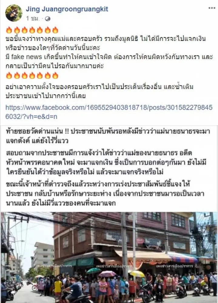 ประชาชนแห่มารอนับร้อยแห่มารอรับเงินกับ "แม่ธนาธร" พี่สาวประกาศชัด "คือ fake news ไม่ได้มีการจะไปแจกเงินหรือข้าวของใดๆที่วัดด่านวันนี้"