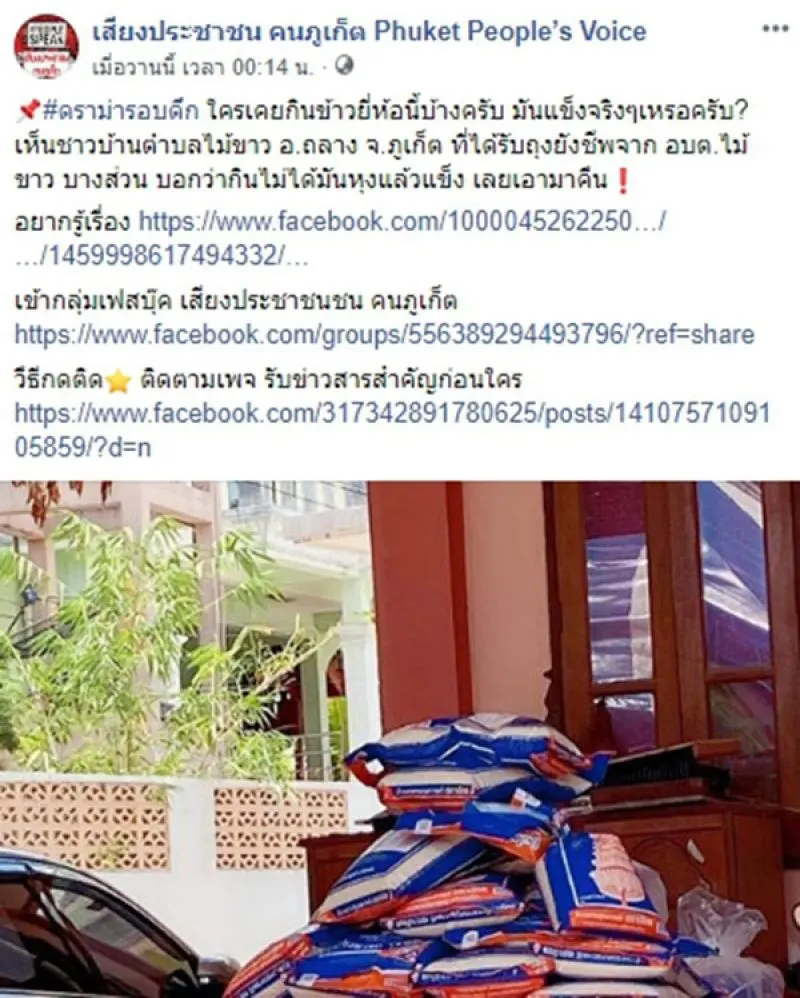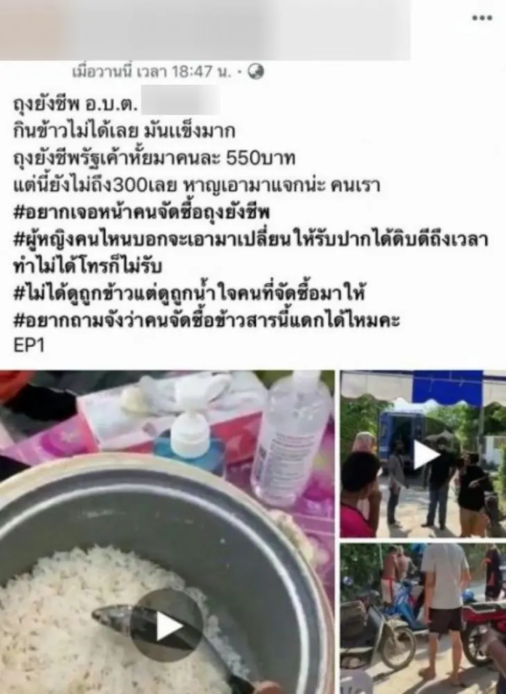 จากกรณีที่มีผู้ใช้เฟซบุ๊กรายหนึ่ง โพสต์ภาพขณะหุงข้าว พร้อมระบุว่า ถุงยังชีพ อ.บ.ต. แห่งหนึ่ง กินข้าวไม่ได้เลย มันแข็งมาก ถุงยังชีพรัฐเขาให้มาคนละ 550 บาท แต่นี่ยังไม่ถึง 300 เลย หาเอามาแจกนะคนเรา อยากเจอหน้าคนจัดซื้อถุงยังชีพ ผู้หญิงคนไหนบอกจะเอามาเปลี่ยนให้รับปากได้ดิบดีถึงเวลาทำไม่ได้โทรไม่รับ ไม่ได้ดูถูกข้าวแต่ดูถูกน้ำใจคนที่จัดซื้อมาให้ อยากถามจังว่าคนจัดซื้อข้าวสารนี้กินได้ไหมคะ