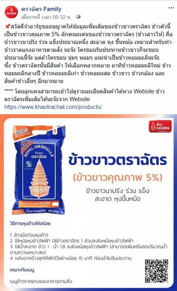ล่าสุดทางด้าน ข้าวตราฉัตร ก็ไม่ได้อยู่เฉย ได้ออกมาบอกวิธีการหุงข้าวที่ถูกวิธี และหุงอย่างไร ใส่ปริมาณน้ำเท่าไหร่ถึงจะขึ้นหม้อ โดยได้โพสต์ผ่านทางเพจ ตราฉัตร Family พร้อมระบุข้อความว่า