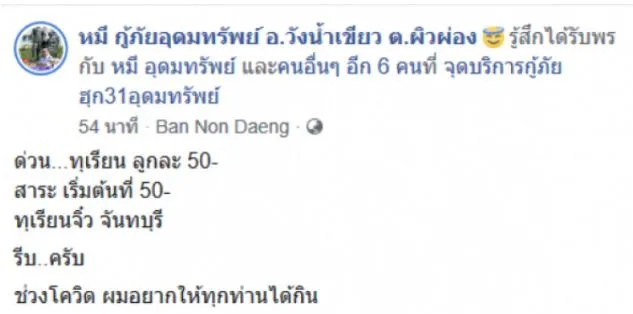 โดยเมื่อวันที่ 18 เมษายน 63 ผู้ใช้เฟสบุ๊ค หมี กู้ภัยอุดมทรัพย์ อ.วังน้ำเขียว ต.ผิวผ่อง ได้โพสต์ข้อความระบุว่า ด่วน ทุเรียน ลูกละ 50 บ. สาระ เริ่มต้นที่ 50 ทุเรียนจิ๋ว จันทบุรี รีบรับ ช่วง โควิด ผมอยากให้ทุกท่านได้กิน