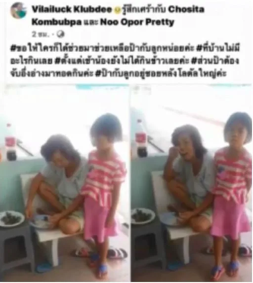 หลังผู้ใช้เฟสบุ๊คชื่อ Vilailuck Klubdee ได้มีการเผยแพร่ภาพของสองแม่ลูกอาศัยอยู่ที่ห้องแถวแห่งหนึ่ง โดยผู้เป็นแม่ นั่งบนม้านั่งหินอ่อน กำลังทานข้าวกับอึ่งอ่างทอด โดยมีลูกสาวอายุ 7 ขวบ ยืนอยู่ข้างๆ พร้อมข้อความว่า ขอให้ใครก็ได้ช่วยมาช่วยเหลือป้ากับลูกหน่อยค่ะ ที่บ้านไม่มีอะไรกินเลย ตั้งแต่เช้าน้องยังไม่ได้กินข้าวเลยค่ะ ส่วนป้าต้องจับอึ่งอ่างมาทอดกินค่ะ ป้ากับลูกอยู่ซอยหลังโลตัสใหญ่ค่ะ ทำให้ชาวโลกออนไลน์ ต่างพากันแสดงความสงสาร และแสดงความจำนง ที่จะเข้าไปช่วยเหลือเป็นจำนวนมาก