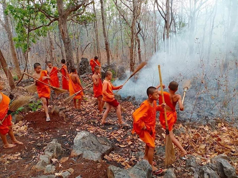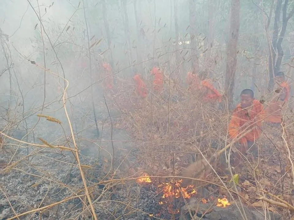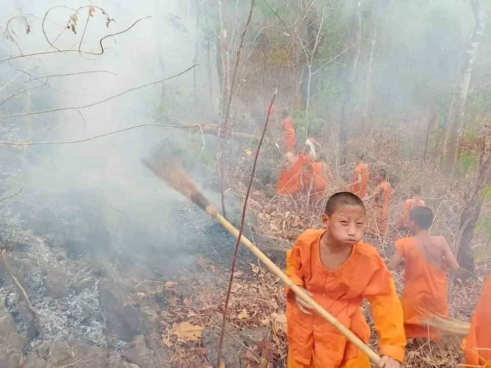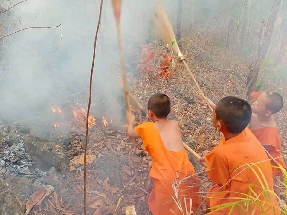 เกิดไฟป่าลุกลามขึ้นดอยที่วัดพระบาทผาหนาม ทำให้พระสงฆ์และเณร ต้องออกมาสะกัดไฟกันอย่างหนัก