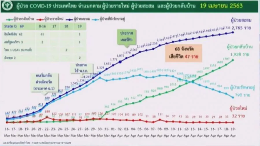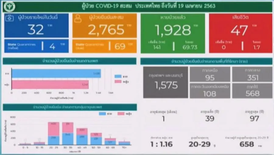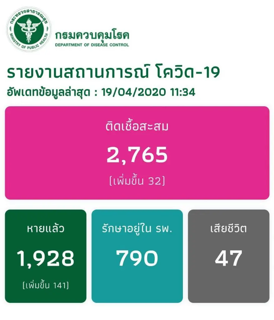 ล่าสุด ศูนย์บริหารสถานการณ์โควิด19 นายแพทย์ทวีศิลป์ วิษณุโยธิน โฆษกกระทรวงสาธารณสุข และ โฆษกศูนย์บริหารสถานการณ์การแพร่ระบาดของโรคติดเชื้อไวรัสโคโรนา 2019 (โควิด-19) หรือ ศบค. ได้อัพเดตผู้ ป่ ว ย ประจำวันที่ 19 เมษายน 2563 เวลา 11.30 น. ว่าพบผู้ติดรายใหม่เพิ่มอีก 32 ราย รวมสะสม 2,765 ราย หายป่วยแล้ว 1,928 ราย ยังรักษาอยู่ในโรงพยาบาลอีก 790 ราย ส่วนวันนี้มีข่าวดีที่ไม่มีผู้ เ สี ย จึงทำให้ยอดผู้ เ สี ย คงเดิมที่ 47 ราย