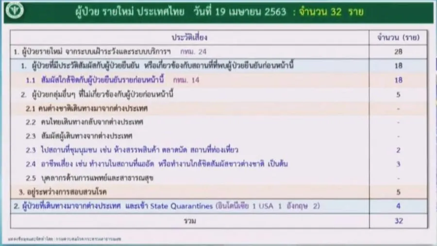 รายละเอียดผู้ป่วยรายใหม่ในประเทศไทย ประจำวันที่ 19 เมษายน 2563 ทั้งสิ้น 32 รายมีดังนี้