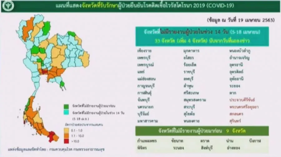 นอกจากนี้โฆษกศบค. ยังได้เผยอีกว่า 33 จังหวัดที่ 14 วันมานี้ไม่มีผู้ป่วยใหม่เลย ได้แก่ 1.เชียงราย 2.เพชรบุรี 3.เพชรบูรณ์ 4.แพร่ 5.แม่ฮ่องสอน 6.กาญจนบุรี 7.จันทบุรี 8.นครนายก 9.บุรีรัมย์ 10.มหาสารคาม 11.มุกดาหาร 12.ยโสธร 13.ร้อยเอ็ด 14.ราชบุรี 15.ลพบุรี 16.ลำพูน 17.ศรีสะเกษ 18.สมุทรสงคราม 19.สระบุรี 20.สุโขทัย 21.หนองบัวลำภู 22.อำนาจเจริญ 23.อุดรธานี 24.อุตรดิตถ์ 25.อุทัยธานี 26.หนองคาย 27.กาฬสินธุ์ 28.ประจวบคีรีขันธ์ 29.พระนครศรีอยุธยา 30.สกลนคร 31.สุรินทร์ 32.ตาก และ 33.ระยอง