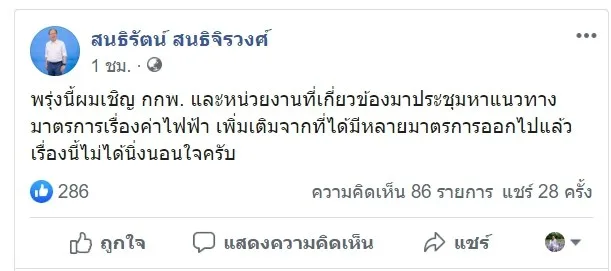 วันที่ 19 เมษายน 2563 นายสนธิรัตน์ สนธิจิรวงศ์ รัฐมนตรีว่าการกระทรวงพลังงานและเลขาธิการพรรคพลังประชารัฐ โพสต์ข้อความในเฟซบุ๊กส่วนตัว โดยระบุว่าในวันพรุ่งนี้(20 เม.ย.)จะเชิญ คณะกรรมการกำกับกิจการพลังงาน(กกพ.) และหน่วยงานที่เกี่ยวข้องมาประชุมหาแนวทางมาตรการเรื่องค่าไฟฟ้า