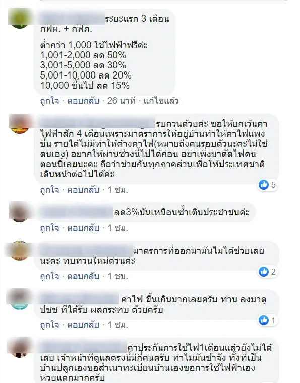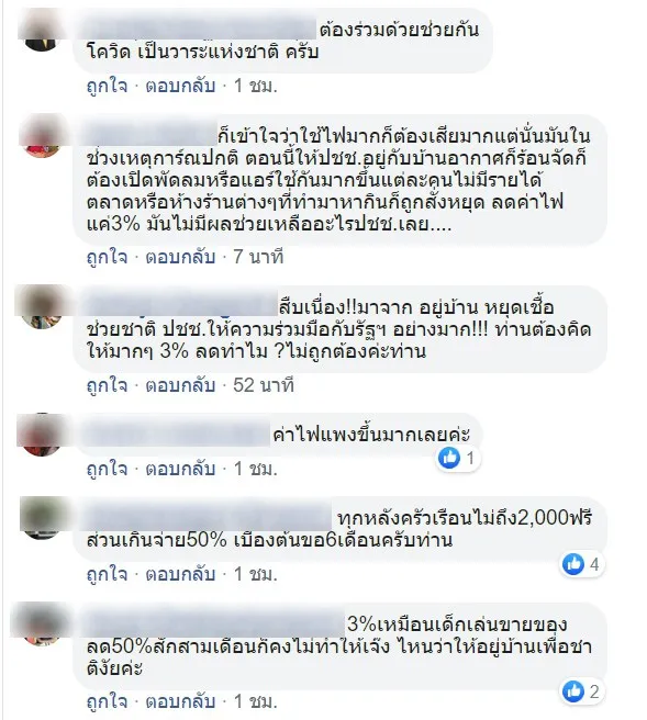 ซึ่งทั้งนี้ได้มีประชาชนจำนวนมาก ได้เข้ามาคอมเมนต์แสดงความคิดเห็นของโพสต์ดังกล่าว โดยส่วนใหญ่จะเป็นในเชิงขอให้แก้ไขปัญหาค่าไฟที่แพงขึ้น รวมถึงให้มีการลดค่าไฟหรือยกเว้นการเก็บค่าไฟช่วงของการกักตัวอยู่บ้านของประชาชน
