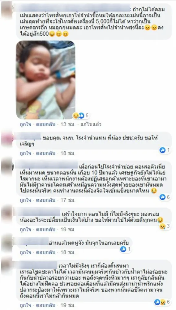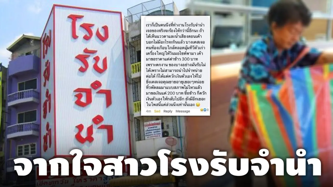 เราเป็นคนหนึ่งที่ทำงานโรงรับจำนำเจอของจริงจะร้องไห้กว่านี้อีกนะ ถ้าได้เห็นแววตาและน้ำเสียงตอนเค้าบอกไม่มีอะไรจะกินแล้ว บางเคสเจอคนท้องเกือบใกล้คลอด อุ้มทีวีตัวเก่าเครื่องใหญ่ต้องให้วินมอเตอร์ไซต์พามาเขามาขอราคาค่าข้าวแค่ 300 บาทเพราะตกงาน ของบางอย่างมันรับไม่ได้เพราะไม่สามารถนำไปจำหน่ายต่อได้ ก็ได้แต่ควักเงินของตัวเองให้เขาไป ยิ่งเจอเคสที่คุณยายอายุเยอะๆหน่อย หิ้วพัดลมใกล้พังสภาพไม่ไหวแล้วมาขอเงินแค่ 200 ซื้อข้าวก็ควักเงินตัวเองให้กลับไปอีก ยังมีอีกเยอะในโพสต์นี้แค่ส่วนหนึ่งเท่านั้นเอง
