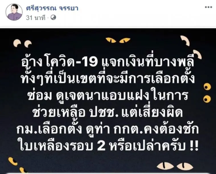 18 เม.ย.63 - นายศรีสุวรรณ จรรยา เลขาธิการสมาคมองค์การพิทักษ์รัฐธรรมนูญไทย โพสต์ข้อความผ่านเฟซบุ๊กระบุว่า "อ้างโควิด-19 แจกเงินที่บางพลี ทั้งๆที่เป็นเขตที่จะมีการเลือกตั้งซ่อม ดูเจตนาแอบแฝงในการช่วยเหลือประชาชน แต่เสี่ยงผิดกฎหมายเลือกตั้ง ดูท่า กกต.คงต้องชักใบเหลืองรอบ 2 หรือเปล่าครับ"