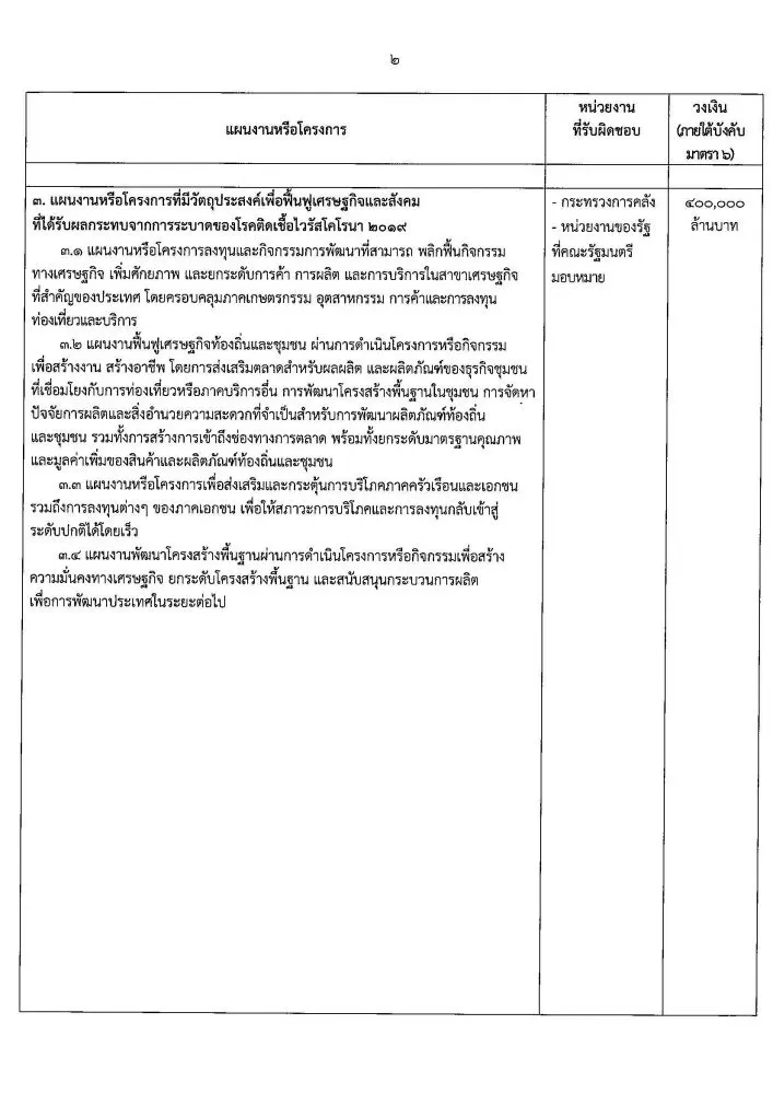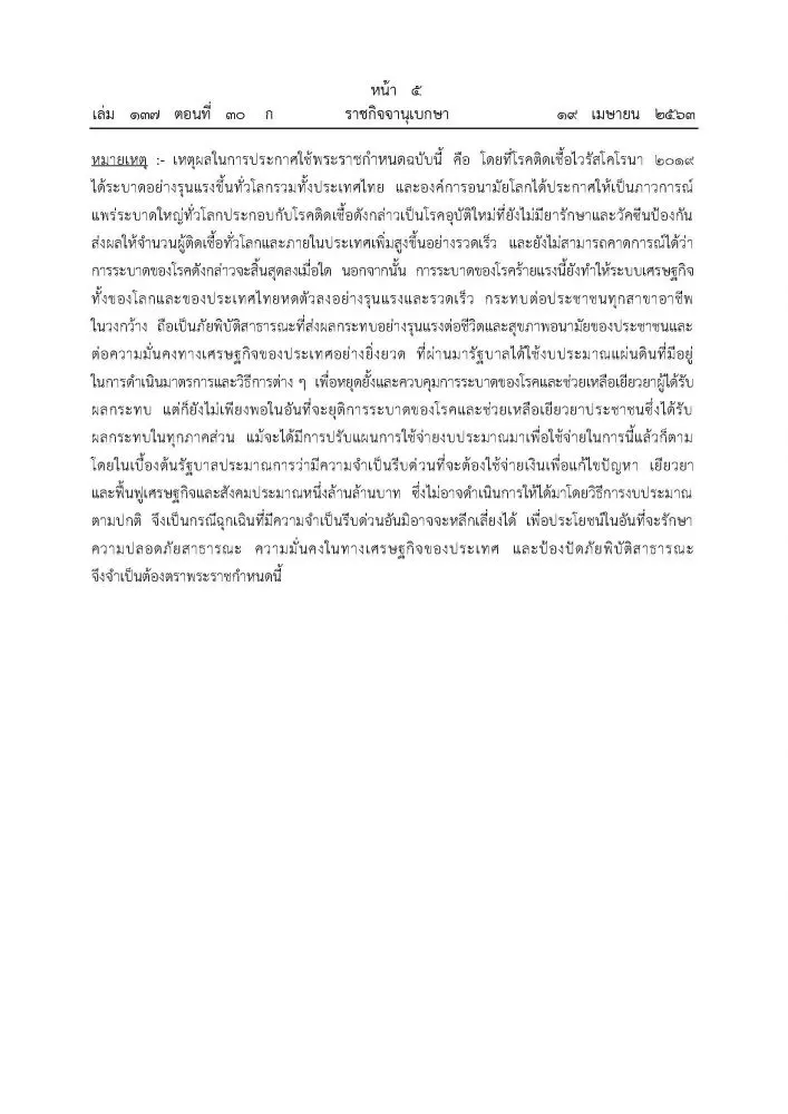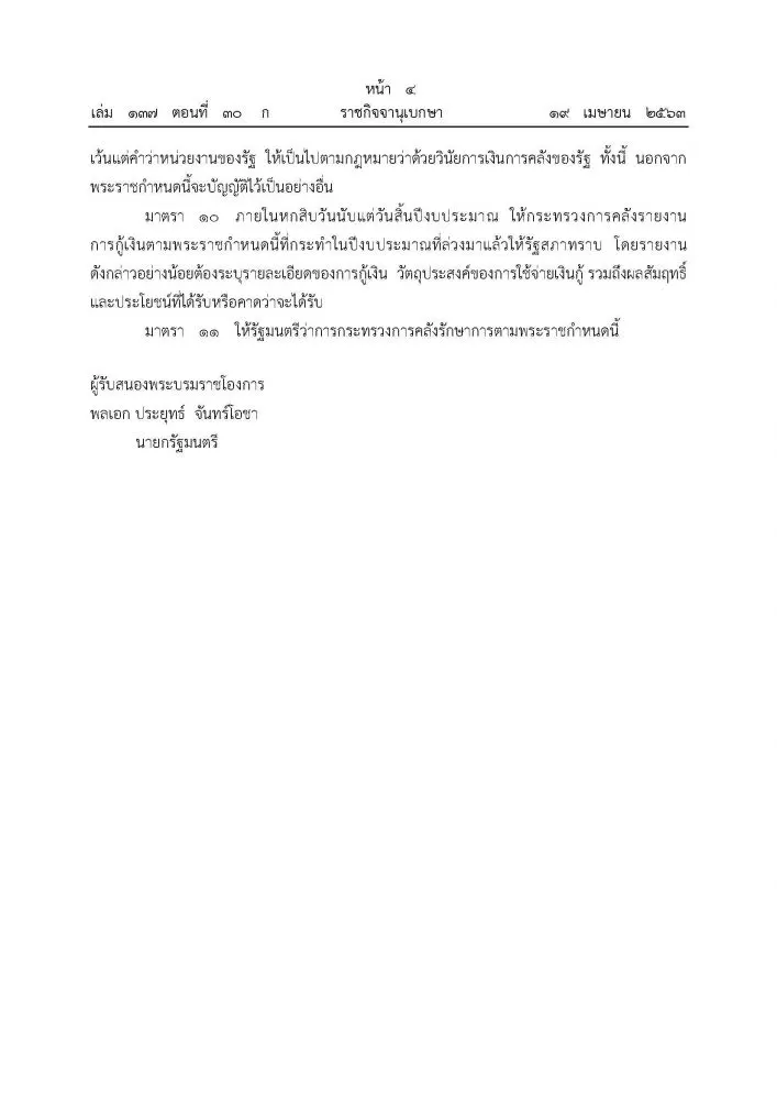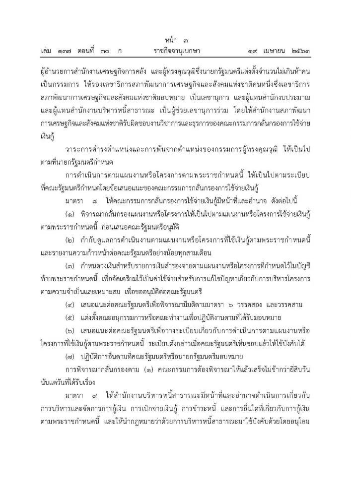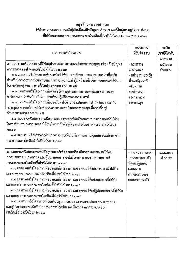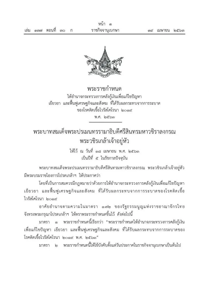 วันที่ 19 เมษายน 63 ราชกิจจานุเบกษาเผยแพร่ประกาศ พระราชกำหนด ให้อำนาจกระทรวงการคลังกู้เงินเพื่อแก้ไขปัญหาเยียวยา และฟื้นฟูเศรษฐกิจและสังคม ที่ได้รับผลกระทบจากการระบาด ของโรคโควิด-19 พ.ศ. 2663 วงเงินกู้ไม่เกิน 1 ล้านล้านบาท