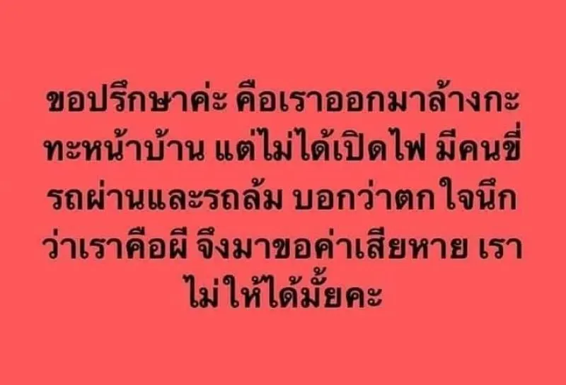 ขอปรึกษาค่ะ คือเราออกมาล้างกระทะหน้าบ้าน แต่ไม่ได้เปิดไฟ มีคนขี่รถผ่านและรถล้ม บอกว่าตกใจ จึงมาขอค่าเสียหาย เราไม่ให้ได้ไหมคะ