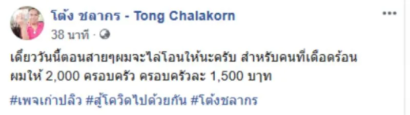ทั้งนี้ได้โพสต์อีกว่า เดี๋ยววันนี้ตอนสายๆผมจะไล่โอนให้นะครับ สำหรับคนที่เดือดร้อน ผมให้ 2,000 ครอบครัว ครอบครัวละ 1,500 บาท