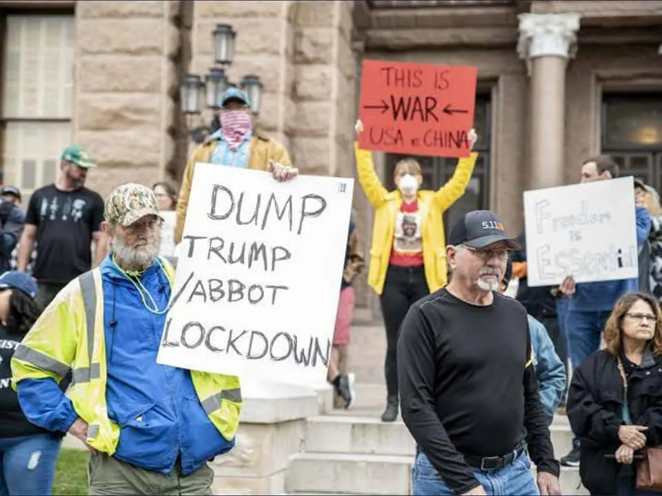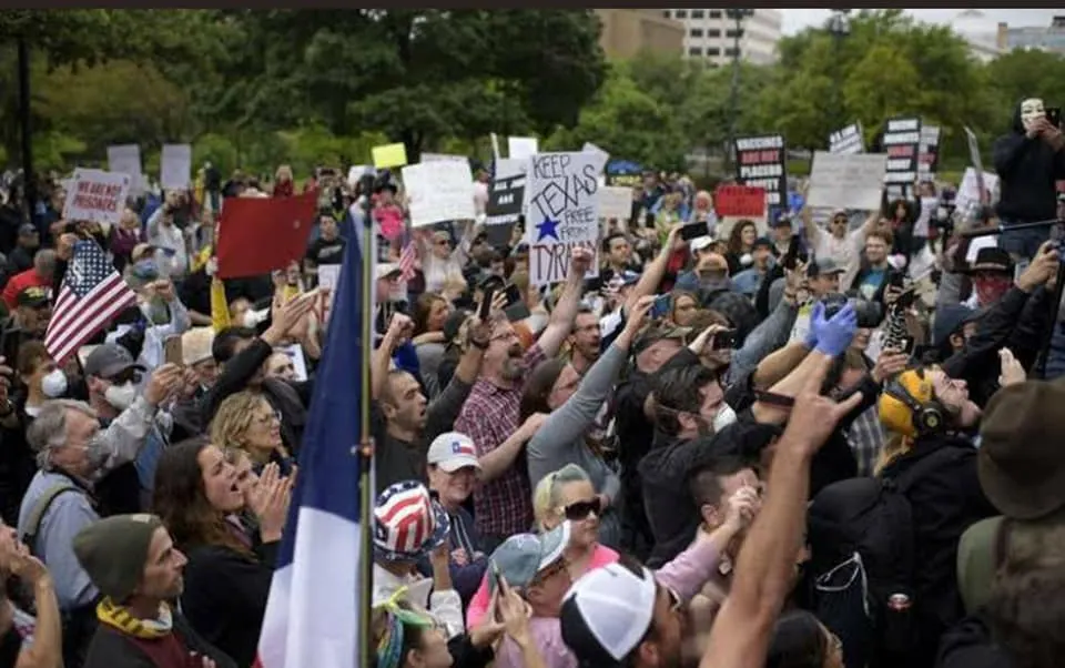 ชาว Texas รวมตัวกันประท้วงคำสั่ง lock down ของผู้ว่าการรัฐ บอกว่าจะไม่ใส่ mask เชื่อว่าร่างกายเราแข็งแรงดี ส่วนใหญ่เป็น anti-vaxxers บอกว่าเราไม่ฉีดวัคซีนร่างกายเลยแข็งแรง ละดูชุมนุมรวมๆ ตะโกนใส่กัน ไม่มีใครใส่ mask