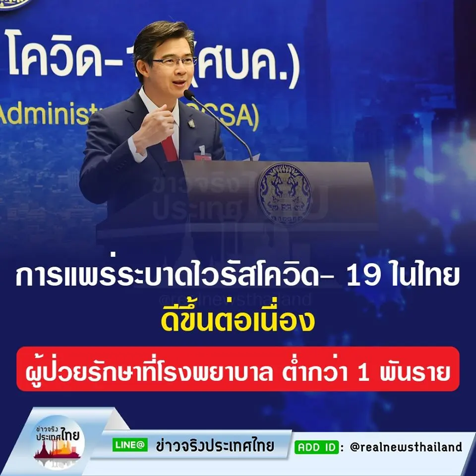 โฆษก ศบค. รายงานจำนวนผู้ป่วยรักษาที่โรงพยาบาลในไทย ต่ำกว่าพันราย สถานการณ์การแพร่ระบาดไวรัสโควิด 19 ในไทยดีขึ้นต่อเนื่อง