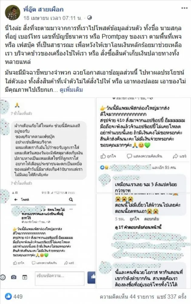 ล่าสุดได้มีเพจเฟซบุ๊ค พี่อู๊ด สายเผือก ได้โพสต์เตือนภัยชาวโซเชียลที่ได้ทิ้งข้อมูลส่วนตัว ตามคอมเม้นท์ พร้อมระบุข้อความว่า นี่ไงล่ะ สิ่งที่จะตามมาจากการที่เราไปโพสต์ข้อมูลส่วนตัว ทั้งชื่อ นามสกุล ที่อยู่ เบอร์โทร เลขที่บัญชีธนาคาร หรือ Promtpay ของเรา ตามพื้นที่เพจ หรือ เฟสบุ๊ค ที่เป็นสาธารณะ เพื่อหวังให้เขาโอนเงินหลักร้อยมาช่วยเหลือเรา บริจาคข้าวของเครื่องใช้ให้เรา หรือ สั่งซื้อสินค้าเก็บเงินปลายทางทั้งหลายแหล่ะ