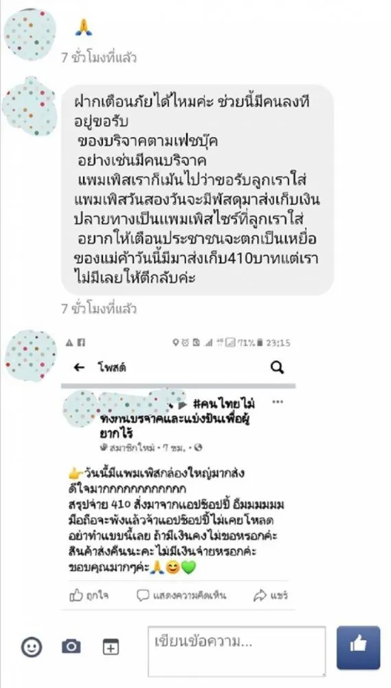 ส่วนใครที่ซื้อของออนไลน์ บางทีก็เปิดใจนิดนึงเถอะครับ ถ้าพิจารณาแล้ว ร้านค้า/แม่ค้า เขามีที่อยู่เป็นหลักแหล่ง มีการค้าขายมานาน มีลูกค้าเก่าๆ มารีวิวให้ โอนได้ก็โอนเลยเถอะ ไม่ใช่มัวแต่กลัวจะเสียเงินหลักร้อย เลยเอาข้อมูลส่วนตัวไปโพสต์ออกอากาศ คราวนี้แหละ อาจจะเสียเป็นพันเป็นหมื่นแทนเลยนะ กดแชร์ เพื่อช่วยกันเตือนภัย ไม่ให้มีใครตกเป็นเหยื่อของมิจฉาชีพอีก