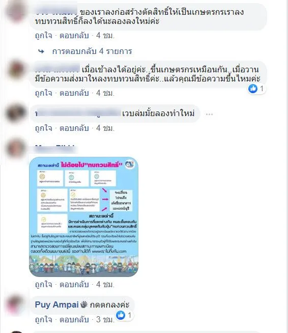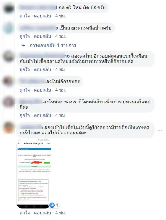 ทั้งนี้ ก็ต้องรอหน่วยงานที่เกี่ยวข้องเข้ามาให้คำตอบกับปัญหาที่เกิดขึ้น คาดว่าระบบอาจจะยังไม่สมบูรณ์ 100 เปอร์เซ็น ต่อมามีผู้ใช้เฟซบุ๊กรายนึงที่เกิดปัญหาคล้ายๆกันเล่าว่า "ของเราลงก่อสร้างตัดสิทธิ์ให้เป็นเกษตรกรเราลงทบทวนสิทธิ์ก็ลงได้นะลองลงใหม่ค่ะ"