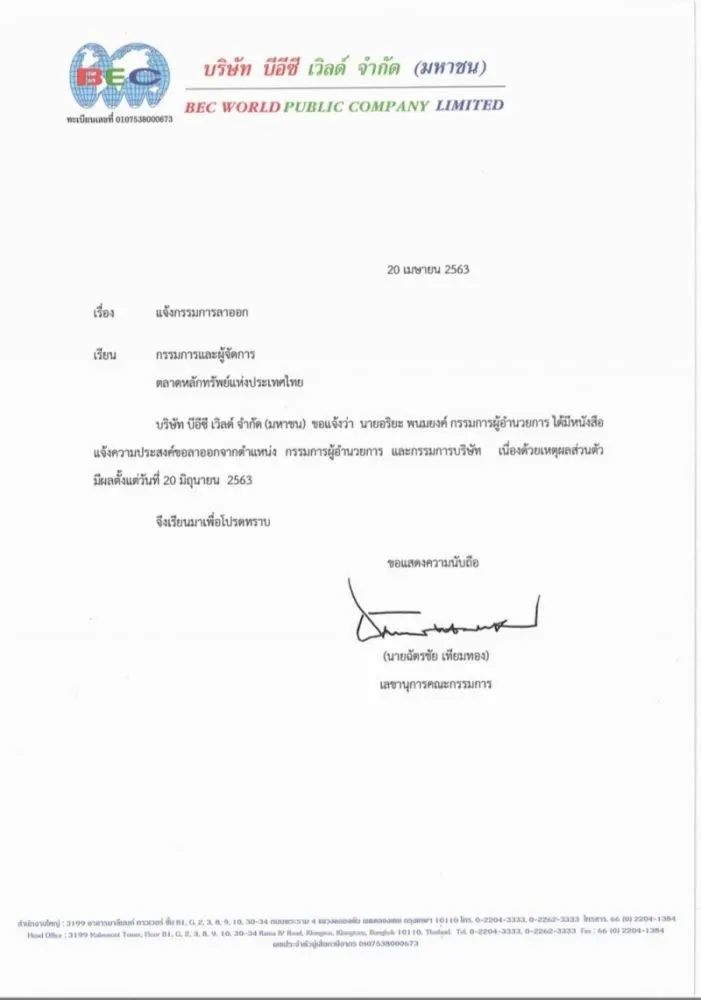 20 เมษายน 2563 บริษัท บีอีซีเวิล์ด จำกัด(มหาชน) หรือช่อง 3 ได้แจ้งต่อตลาดหลักทรัพย์แห่งประเทศไทย ว่า บี๋ อริยะ พนมยงค์ ได้ประกาศลาออกจากตำแหน่งกรรมการผู้อำนวยการ ซึ่งจะมีผลตั้งแต่ 20 มิถุนายนนี้เป็นต้นไป