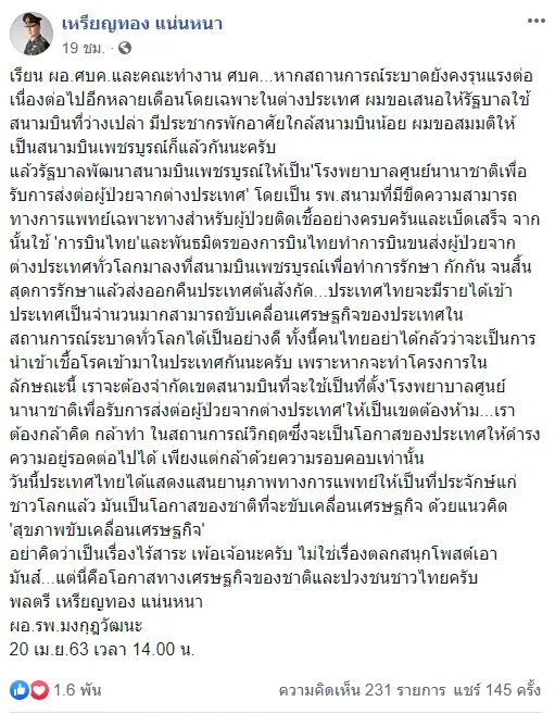 เมื่อวันที่ 20 เมษายน 2563 พล.ต.นพ.เหรียญทอง แน่นหนา ผอ.โรงพยาบาลมงกุฎวัฒนะ อดีตแกนนำ กปปส. โพสต์ข้อความทางเฟซบุ๊ก ความว่า