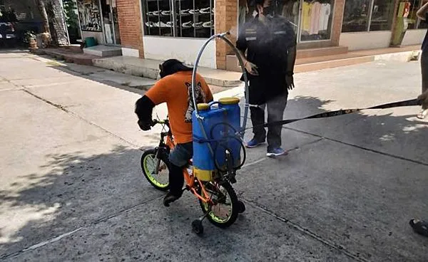 นายอุเทน ยังประภากร รักษาการประธานกรรมการบริษัทฟาร์มจระเข้และสวนสัตว์สมุทรปราการ ชี้แจงว่า ลิงตัวนี้ชอบปั่นจักรยานอยู่แล้ว ส่วนถังฉีดยาได้ติดตั้งไว้บนตะแกรงท้ายจักรยาน ภายในบรรจุน้ำยาฆ่าเชื้อ ชนิดที่ใช้กับร่างกายได้ เจือจางด้วยน้ำสะอาด ติดตั้งหัวฉีดพ่นไปทางด้านหลัง จึงไม่เป็นอันตรายต่อร่างกายลิง พร้อมให้พี่เลี้ยงทดลองพาลิงมาที่จักรยาน ก็พบว่าลิงเดินไปปั่นจักรยานเองโดยไม่มีการบังคับ