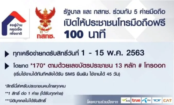 ที่ประชุมร่วมระหว่าง กสทช. กับผู้ให้บริการโทรศัพท์เคลื่อนที่ทั้ง 5 ราย ได้แก่ เอไอเอส ทรู ดีแทค ทีโอที และ บมจ. กสท โทรคมนาคม แคท ได้ข้อสรุปว่า เพื่อเป็นการแบ่งเบาภาระประชาชนในช่วง co vid 19 ผู้ให้บริการทุกรายจะให้สิทธิ์ โทร ฟรี 100 นาที ทุกเครือข่าย 45 วัน