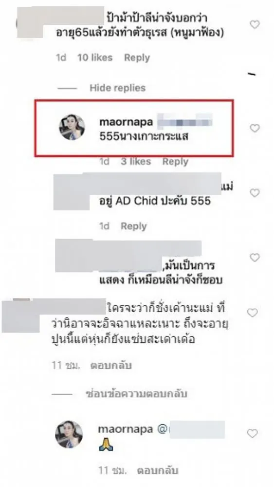 ทางด้าน ม้า อรนภา จึงได้เข้ามาตอบกลับว่า ลีน่าจัง พยายามเกาะกระแส