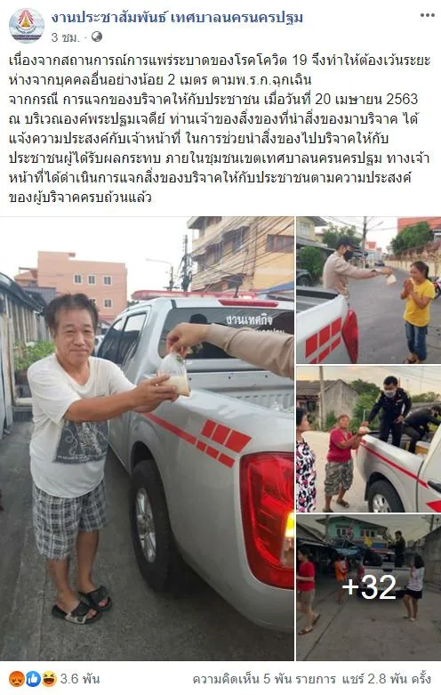 ซึ่งล่าสุด ทางจนท.จากเทศบาลนครปฐม ได้ออกแจกของบริจาคตามบ้านเรือนประชาชนต่างๆ พร้อมโพสต์ลงในเพจ “งานประชาสัมพันธ์ เทศบาลนครนครปฐม” ว่าได้เป็นธุระส่งต่อของบริจาคต่างๆ ให้ถึงมือประชาชน โดยโพสต์ระบุว่า