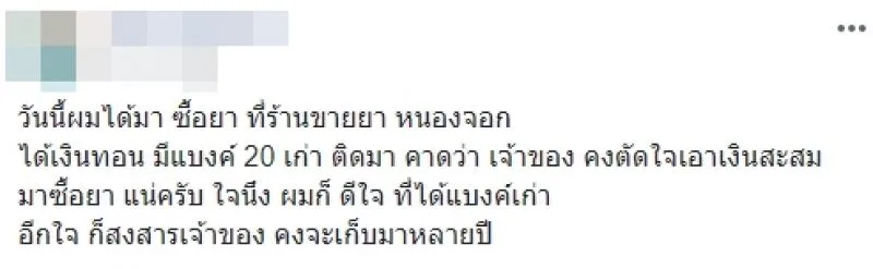 ผู้ใช้เฟซบุ๊กโพสต์ข้อความระบุว่า วันนี้ผมได้มา ซื้อยทา ที่ร้านขายย า หนองจอก ได้เงินทอน มีแบงค์ 20 เก่า ติดมา คาดว่า เจ้าของ คงตัดใจเอาเงินสะสม มาซื้อยา แน่ครับ ใจนึง ผมก็ ดีใจ ที่ได้แบงค์เก่า อีกใจ ก็สงสารเจ้าของ คงจะเก็บมาหลายปี