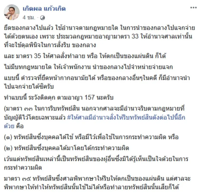 ยึดของกลางไปแล้ว ใช้อำนาจตามกฎหมายใด ในการนำของกลางไปแจกจ่ายได้ด้วยตนเอง เพราะ ประมวลกฎหมายอาญามาตรา 33 ให้อำนาจศาลเท่านั้นที่จะใข้ดุลพินิจในการสั่งริบ ของกลาง และ มาตรา 35 ให้ศาลสั่งทำลาย หรือ ให้ตกเป็นของแผ่นดิน ก็ได้