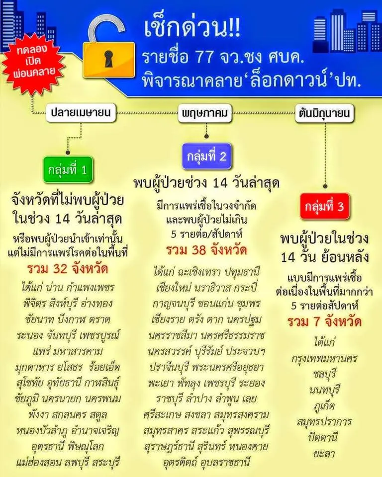 เตรียมเฮ!! จังหวัดที่มีแนวทางจะได้รับพิจารณาผ่อนคลายล็อกดาวน์โดยแบ่งออกเป็น 3 กลุ่ม อยู่กลุ่มไหนกันบ้าง!?!