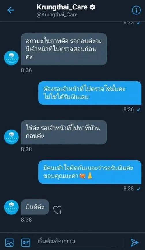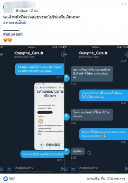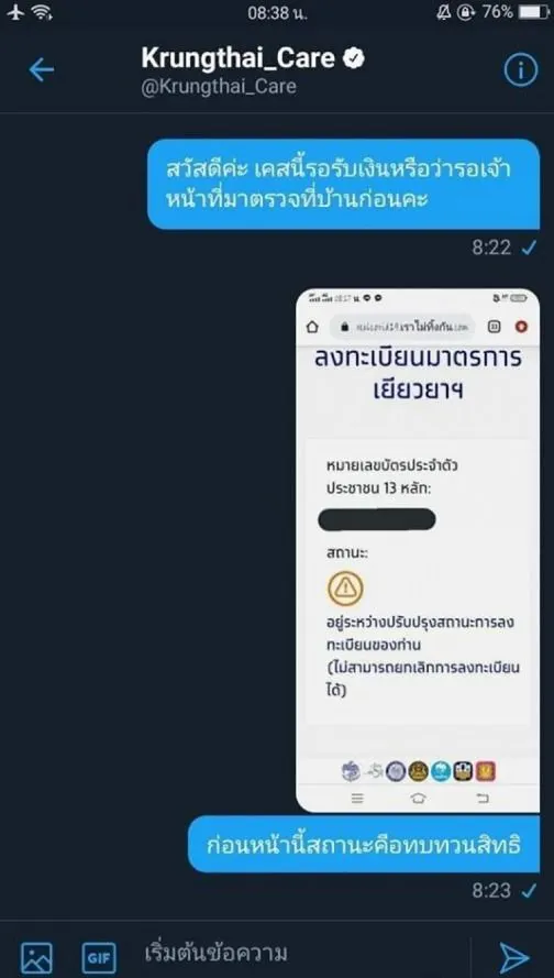 ล่าสุด ผู้ใช้เฟสบุ๊ครายหนึ่งได้โพสต์ได้โพสต์แชทอัพเดทสถานะ โดยได้ระบุว่า “รอเจ้าหน้าที่ตรวจสอบนะคะไม่ใช่รอรับเงินนะคะ”