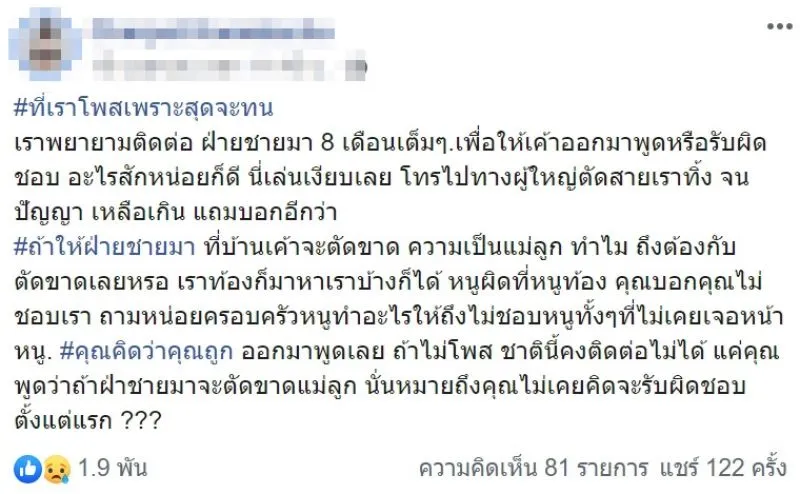 ฝ่ายชายไม่เคยมาหา มาดูแล แต่กลับมีการยืมเงินเรื่อย ๆ รวม 10,000 บาท เมื่อทวงคืนก็ให้มาแค่ 500 บาท และมารู้เรื่องภายหลังอีกว่า ระหว่างที่คบกัน ฝ่ายชายทักจีบผู้หญิงไปทั่ว รวมแล้ว 8 คน