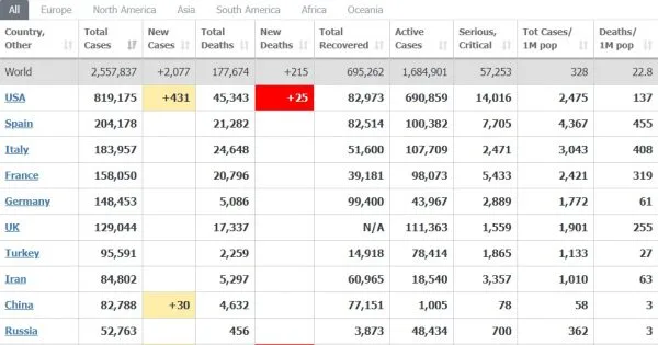 ในสหรัฐฯ ตัวเลขผู้ติดเชื้อสะสมอยู่ที่ 819,175 คน และเสียชีวิตสะสม 45,343 คน สูงสุดในโลกทั้งสองกรณี โดยวันที่ 22 เม.ย. เวลา 11.50 น. ที่ผ่านมา มีผู้ติดเชื้อรายใหม่ 14,016 คน เสียชีวิต 2,475 คน ถือเป็นสถิติใหม่ของจำนวนผู้เสียชีวิตในวันเดียว