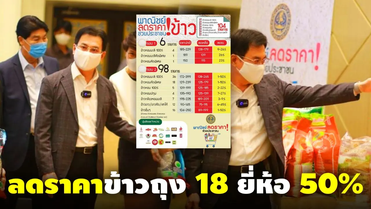 วันที่ 22 เมษายน 2563 นายจุรินทร์ ลักษณวิศิษฏ์ รองนายกรัฐมนตรี และรมว.พาณิชย์ ร่วมกับนายวีระศักดิ์ หวังศุภกิจโกศล รมช.พาณิชย์ นำกรมการค้าภายใน กระทรวงพาณิชย์ จับมือภาคเอกชนจัดทำ โดยนายจุรินทร์ กล่าวว่า สำหรับโครงการพาณิชย์ลดราคาข้าวช่วยประชาชนวันนี้ เป็นการลดราคาข้าวถุงช่วยประชาชน หลังจากที่ดำเนินการมาครั้งหนึ่งเมื่อวันที่ 16 เม.ย.ที่ผ่านมา โดยร่วมมือกับภาคเอกชนลดราคาข้าวถุง ประกอบด้วยข้าว 7 ชนิดรวม 18 ยี่ห้อทั้งหมด 104 รายการลดราคาสูงสุดถึงร้อยละ 50 โดยจะลดตั้งแต่ขณะนี้เป็นต้นไป จนถึงวันที่ 30 มิ.ย.ป็นอย่างต่ำ เพราะจะมีบางรายการที่จะลดต่อเนื่องต่อไปอีกระยะ โดยภาคเอกชนผู้ผลิตและจำหน่ายข้าวบรรจุถุงที่มาร่วมลดราคากับกระทรวงพาณิชย์ครั้งนี้ประกอบด้วย18 ยี่ห้อ ดังนี้