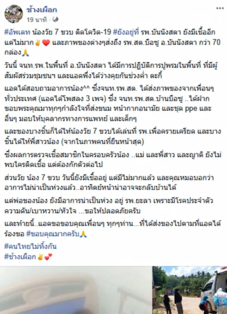 วันที่ 22 เมษายน ทางเพจ ช้างเผือก ได้มีการอัพเดทอาการ เด็กหญิงคนหนึ่ง ซึ่งป่วย Covid ต้องแยกจากครอบครัว แต่ก็ได้รับกำลังใจจากทุกคน โดยระบุว่าน้องวัย 7 ขวบ ที่ติด Covid 19 ยังอยู่ที่ รพ.บันนังสตา ยังมีเชื้ออีก แต่ไม่มาก และภาพของต่างๆส่งถึง รพ.สต.บือซู อ.บันนังสตา กว่า 70 กล่อง