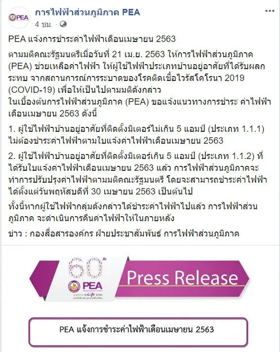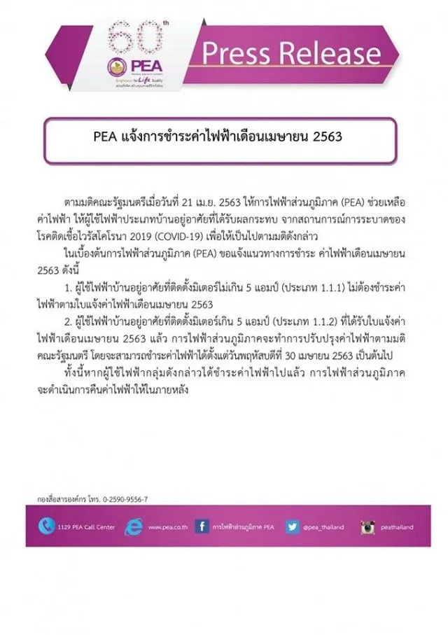 ตามมติคณะรัฐมนตรีเมื่อวันที่ 21 เม.ย. 2563 ให้การไฟฟ้าส่วนภูมิภาค (PEA) ช่วยเหลือค่าไฟฟ้า ให้ผู้ใช้ไฟฟ้าประเภทบ้านอยู่อาศัยที่ได้รับผลกระทบ จากสถานการณ์การระบาดของโรคติดเชื้อไวรัสโคโรนา 2019 (COVID-19) เพื่อให้เป็นไปตามมติดังกล่าว