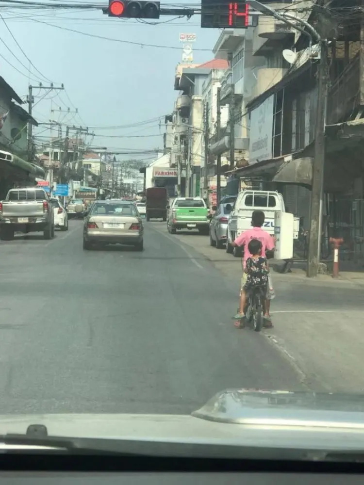 สองพี่น้องจอดจักรยานติดไฟแดงในเวลาที่แดดร้อนจัดพร้อมกับขวดน้ำอัดลมที่ใส่น้ำเปล่าเพื่อไว้ดื่ม